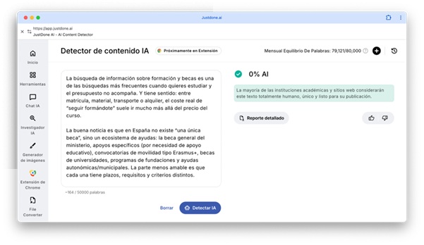 Una herramienta que suele mencionarse en este contexto es JustDone. Se trata de una plataforma que reúne más de 25 herramientas relacionadas con escritura y edición. Entre ellas hay funciones para analizar si un texto presenta patrones asociados a contenido generado por inteligencia artificial.